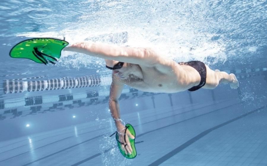 Finger paddles zijn kleine plaatjes die je met elastieken over je vingers bevestigt. Daarna zwem je met extra druk op het water.